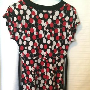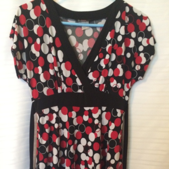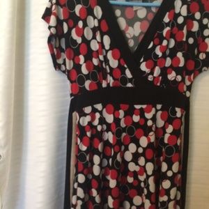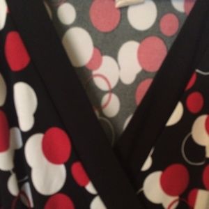 red,black&grey circles, tie back, empire waist with V neck and cap sleeves. Super comfortable stretch fabric.