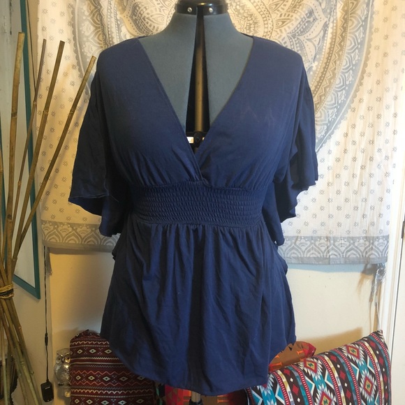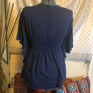 Blue V neck belled short sleeved shirt. Elastic waist. Loose fit