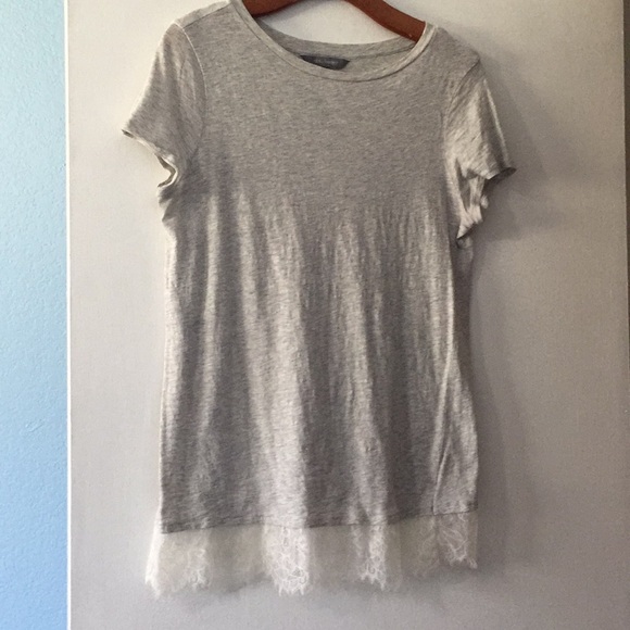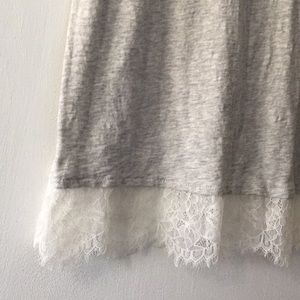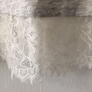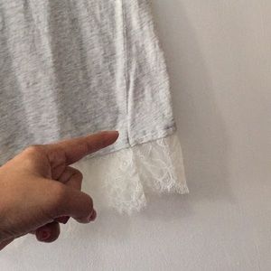 Very cute grey T shirt with white lace detail along bottom. This shirt covers your booty nicely, great for summer! In good used condition. Side seem is crooked but not noticeable when wearing, never bothered me when I was wearing it.