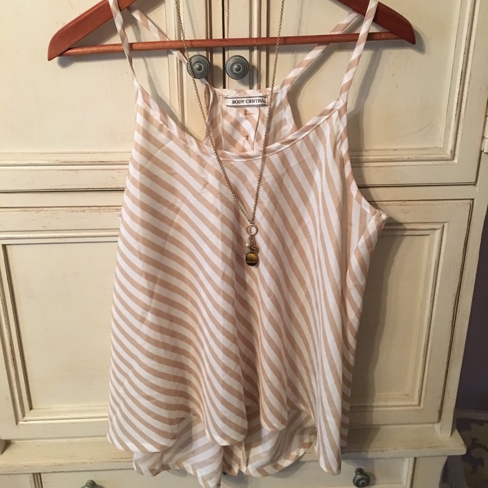 Tan/white striped & super cute with jeans or shorts! The back has 3 stitched buttons then open. (Purchased @ Charming Charlie’s).