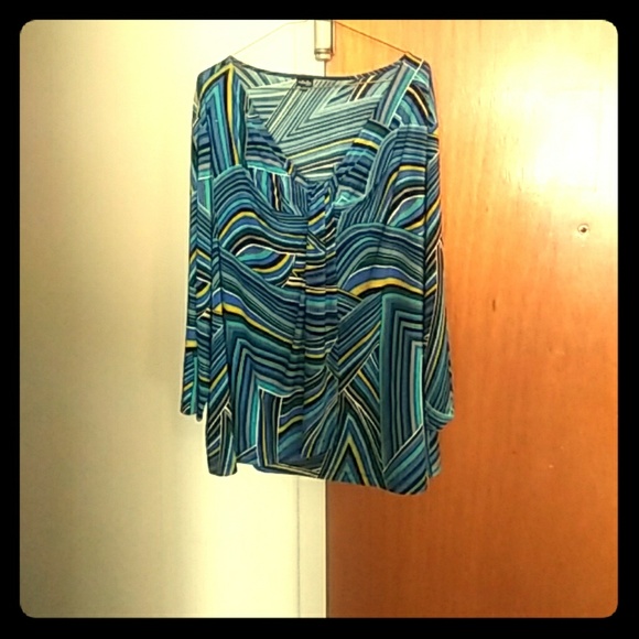 3/4 length sleeve cowl neck striped design in black, blues, yellow, green and white. Rafaella woman