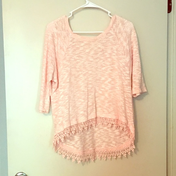 Light pinkish white top with kinda fringe at bottom.high low top .