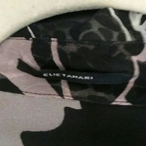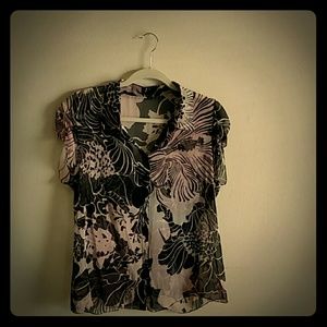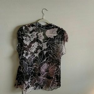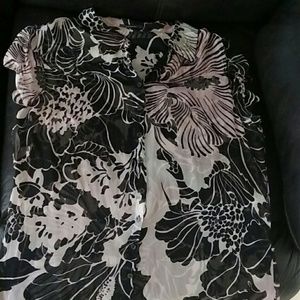 Gorgeous print, sheer with flowering shades of black, beige, and hints of light 🌹 color. From shoulder to bottom is 23 inches. The size doesn't show but it is a 10. 💯 silk. This has been gently used.