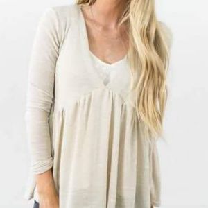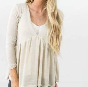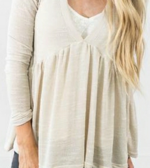 Baby Doll Top in Oatmeal. Very light weight, lots of room and flows really nice. Looks good on!