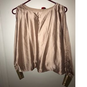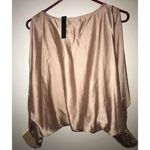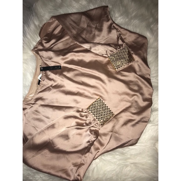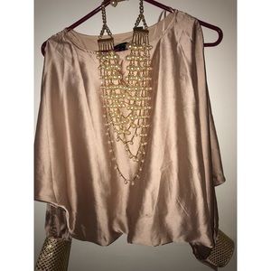 It's a rose gold top. Brand new tags are attached. No damage. It has nice arm openings in both sleeves. Necklace not included. But it can go well with a long pearl necklace. Also on the sleeves it has gold designs