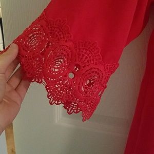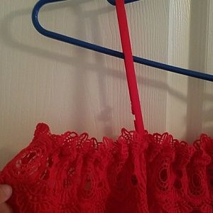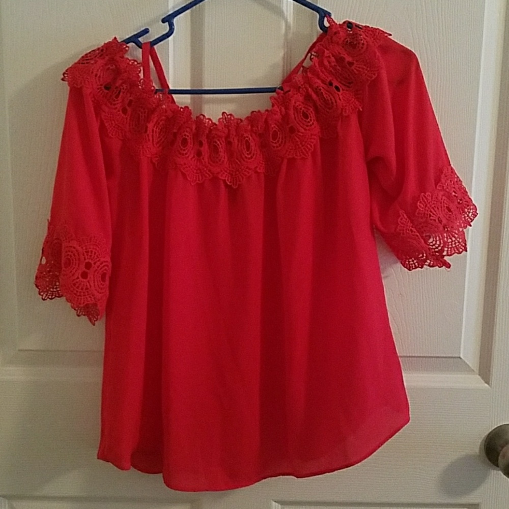 Off the should, adjustable spaghetti straps, lace edging, 3/4 bell sleeves. Worn 2x
