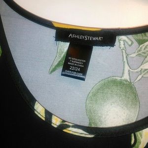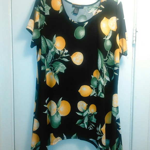 Black lemon/lime print top with a shark bite hemline. Has a scoop neckline that would look great with your favorite necklace. It is polyester & spandex blend material. It can be worn dressy with a black pair of Palazzo pants or casual great with a pair of black leggings and peep toe booties.