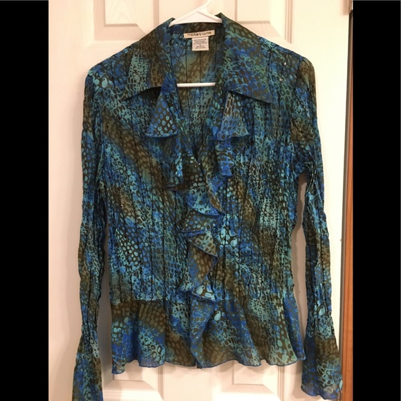 Pretty turquoise and brown button up blouse with ruffled flounce and black sequins
