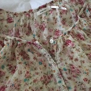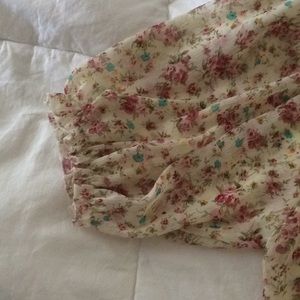 Button down top. Ties at the bottom. Ruffled sleeves