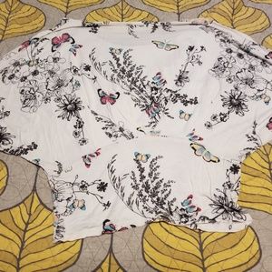 Casual top with floral/outdoor pattern. Large sleeves. The top is fitted on the bottom.