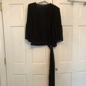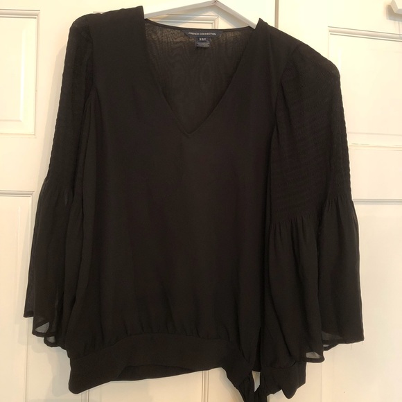 Black French Connection polyester blouse, ties at the waist, v neck
