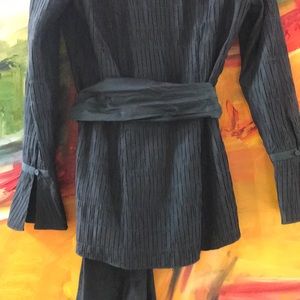 Deep turquoise silk pleated with belt. Bell sleeved with slits