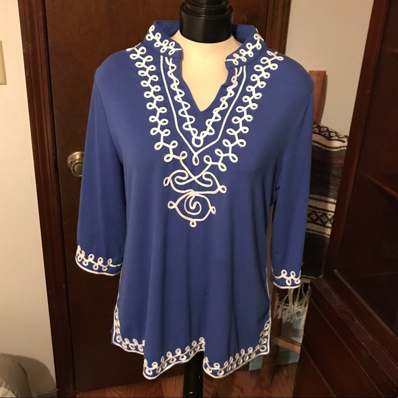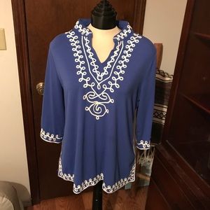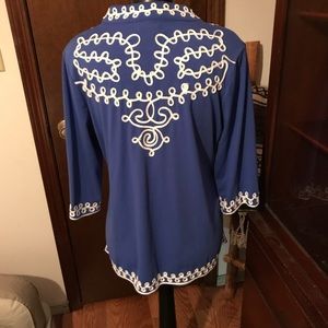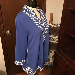 Blue top -white detail embellished trim on neck,back, sleeves, very nice medium weight.