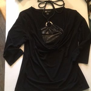This top is very very pretty on. The front piece ties around the neck to reveal the pretty black sparkle piece to give it piazza. Wore only once