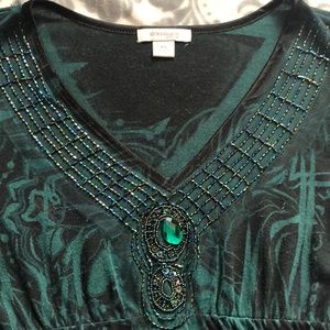 Green and black v-neck top. 3/4 sleeves with accents around neck. Tight midway to create bottom of top to flow. Dress Barn PS