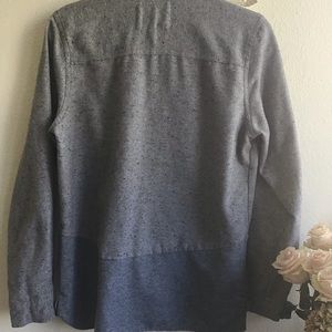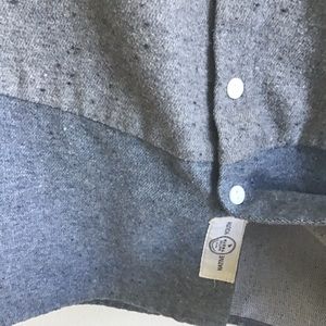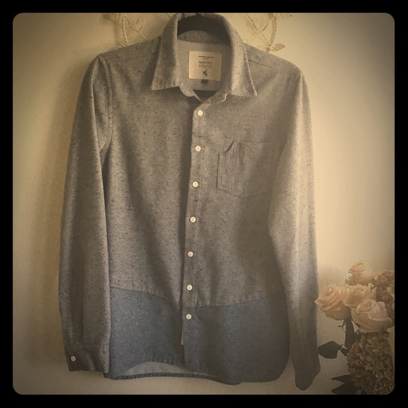 Very soft grey and blue shirt that is really well cut and looks great when on . Another one of my sons shirts that I wore with cream cords and chocolate brown biker boots for a phot shoot