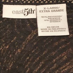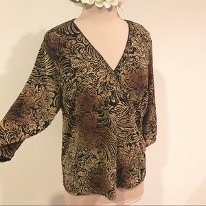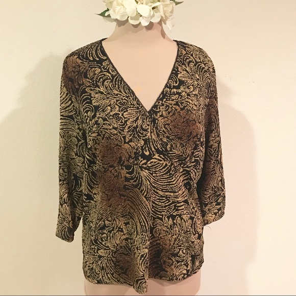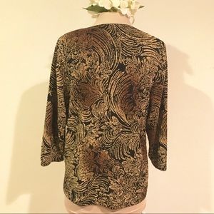 Black and gold stretch top. Fits great if you are a little busty. Soft and comfortable..three-quarter sleeved. Looks really good with jeans or slacks. Gently used, no stains.