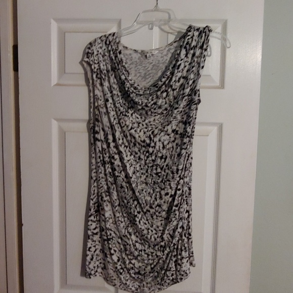 Sleeveless long tunic. Rushing on side. Cowl neckline. Mire form fitting. I wear XL this fits me in medium.