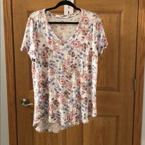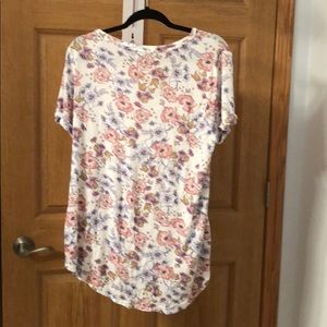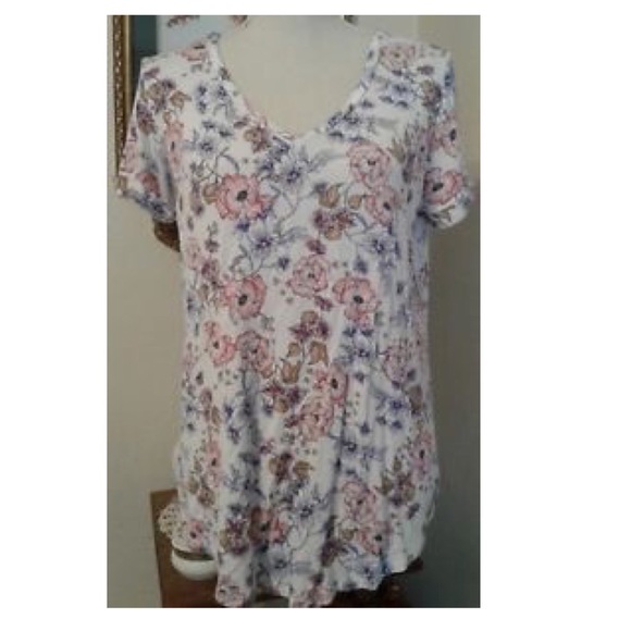 Short cuffed up sleeves. V neck. Shirttail hem. Longer in back. Very soft material. Good condition.