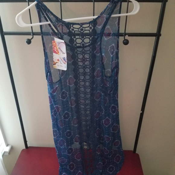 Blue shear tank top with design on back
