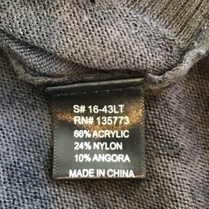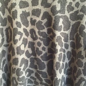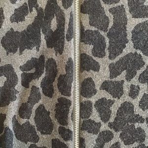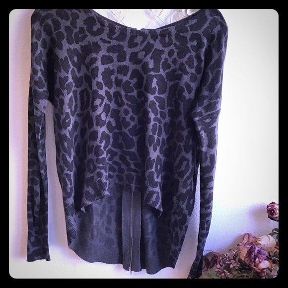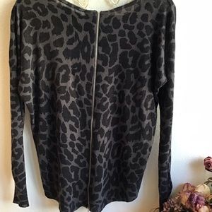 Grey and black leopard print soft knit sweater with full length zip at back . It is very light and looks great with black pants/jeans and winter white velvet cords