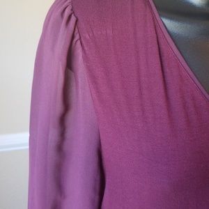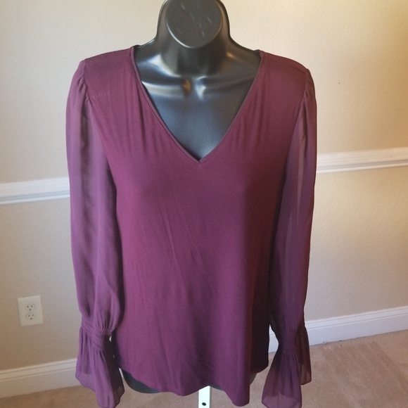 Burgundy V neck blouse with Sheer arms with ruffles at wrist