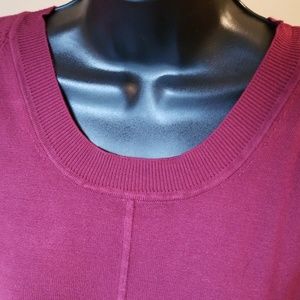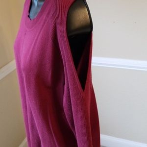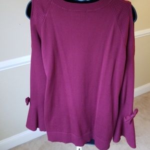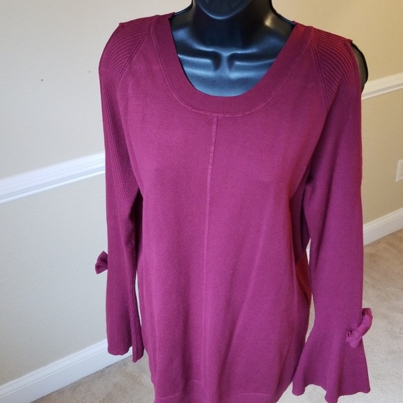 Burgundy cold shoulder sweater with ribbed sleeves. Sleeve have small bowties close to the wrist area. The sleeve flare out a bit. Worn once, great used condition, no damage.