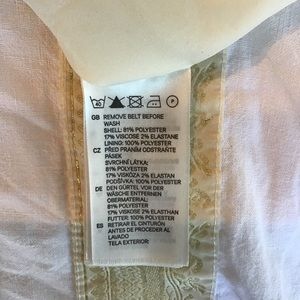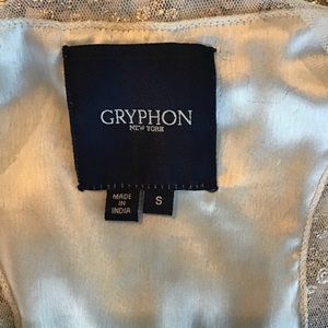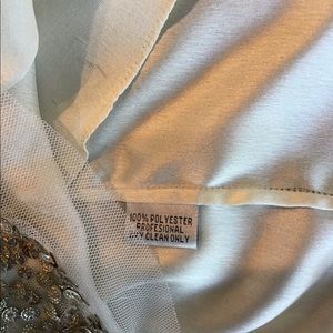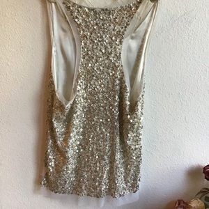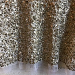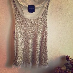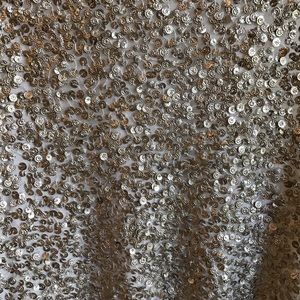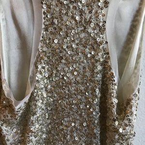 This is quite a spectacular top . It is white silk heavily embellished with silver sequins . The pictures say more than I can , it is exactly as it looks and is actually very heavy . I wore it once with some white silk crepe bell bottoms . As I was taking pictures I noticed a small area where the sequins have come off . It is at the side seam and I think the sequins could be replaced .
