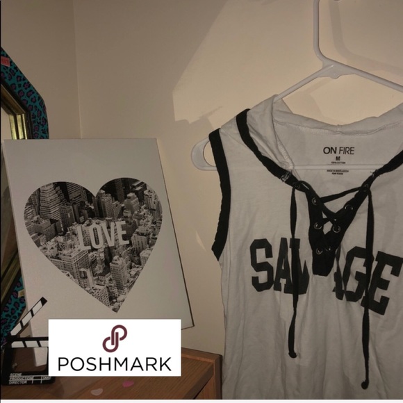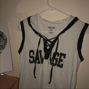 Blacks and white top with a print labeled “savage” and a hood.