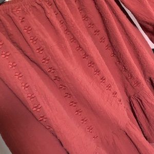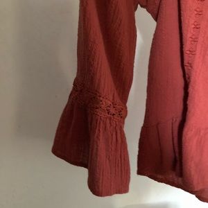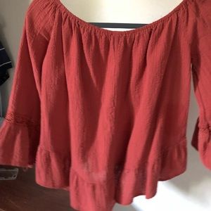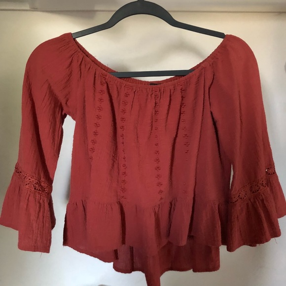 Off the shoulder top. Semi cropped from the front runs a little longer towards the back the end of the sleeves are flared