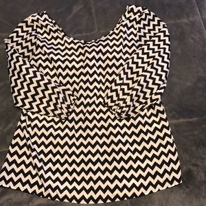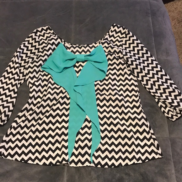 Chevron black & white pattern scoop neck with a big turquoise bow on the back.