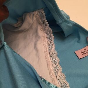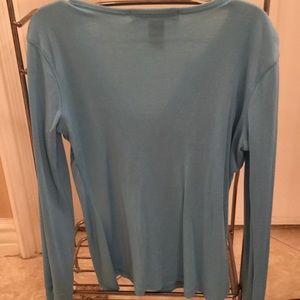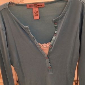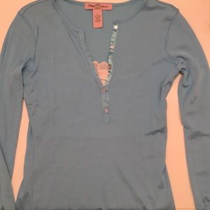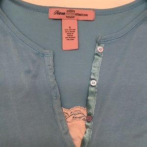 Pretty robin-egg blue ladies shirt with a peek-a-boo lace (which is actually an attached piece sewn across the front underneath). The lace jazzes it up. That, alone will the bright beautiful color, makes this shirt look great with anything. It is a small, but runs a little big (like a medium). Hangs long; has long sleeves, and the material is really comfortable.