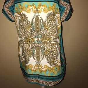 The front is patterned and silky feeling like a scarf. The back is soil cotton feeling aqua/turquoise color.