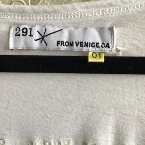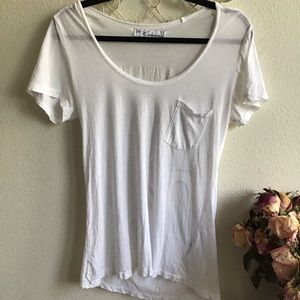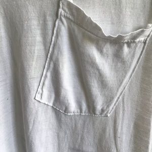 Very cool white T-shirt with patch pocket on front , studded and print lettering on back saying Lovers Rock . There is a very tiny rip just where the label stitching has pulled .