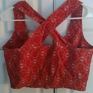 Crop top. High waisted fashion. Buttons in front. Cross detail in back.