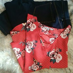 Flower print red blouse. Light flowy fabric detailed neck line.