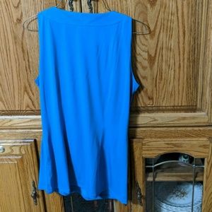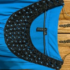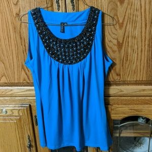 Beautiful dark aqua polyester spandex sleeveless top. Beads woven into a decorative design on front of top. Close up picture shows more of the true color. Nice top for a holiday party!