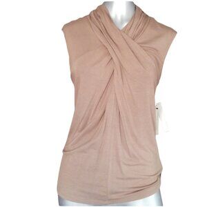 Modern sleeveless super soft top with criss cross neckline that drapes down in a flattering fit. Zip closure at the back. Pull on overhead. Tan color. New with tags