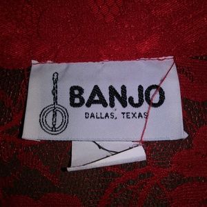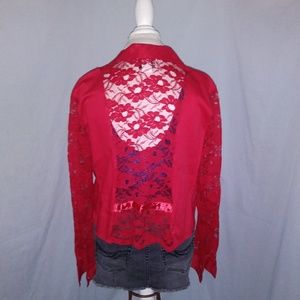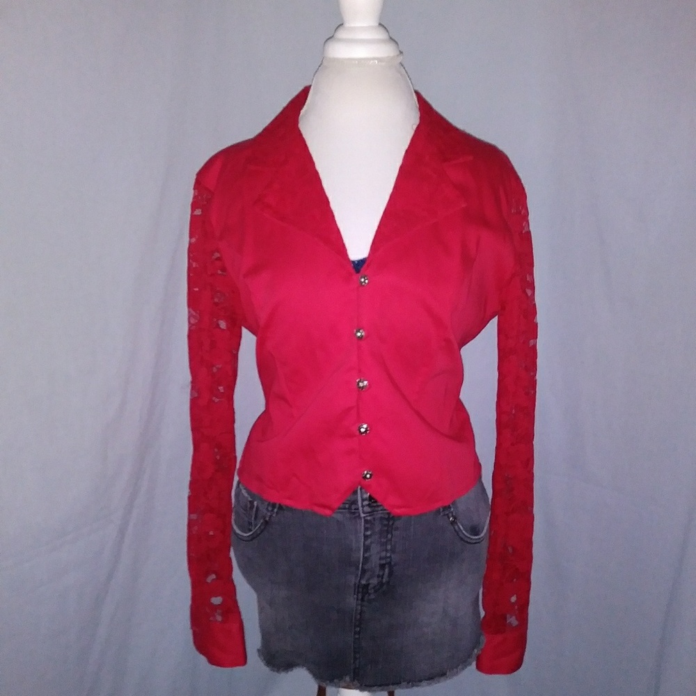 Red cotton, 5 metal front buttons, red lace long sleeves with 1 button on cuffs, lace panel on back