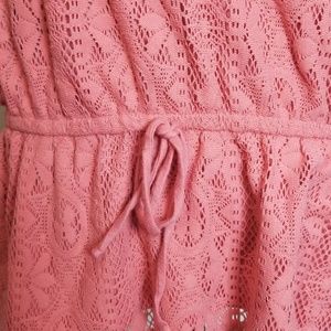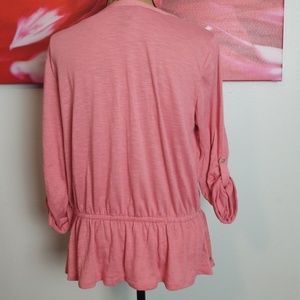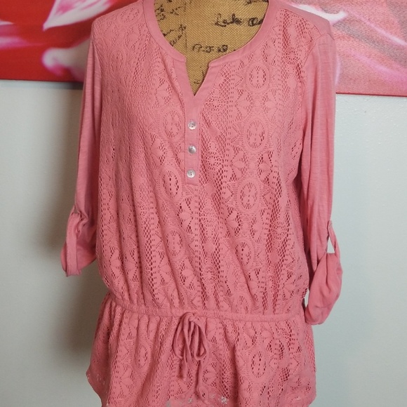 Light coral lace overlap material top. Button on top on front and one button on each sleeve. Body is 70% polyester 30% rayon contrast 100% polyester.