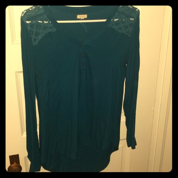 Teal blouse with lace shoulder cut outs. Wide sleeves with buttons at the wrist. Can be warm with unbuttoned with a camisole under or buttoned.