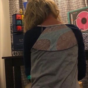 Navy blue top that’s lose fit. Has designs on it and the back of it has see thru lace towards the top. Quarter length sleeves good condition