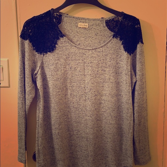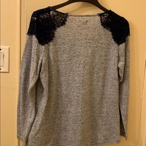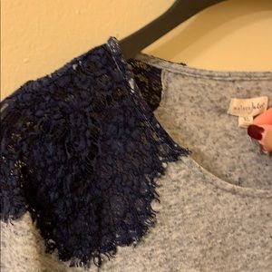 Heather gray (slight sparkle in fabric), navy blue lace on shoulders.