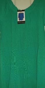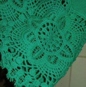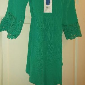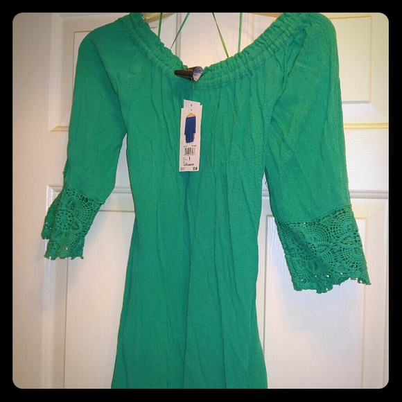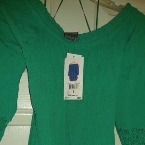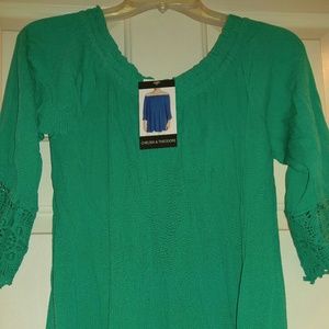 Summer gauzy type of material.can be worn off shoulders.sleeves have a nice detail on them with lace. It's more of a teal green color then a true green.