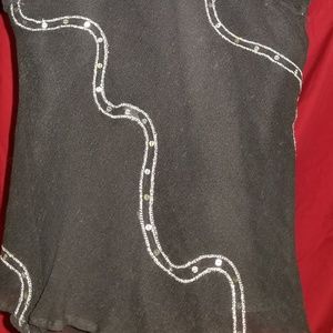Black with shiny beading. Tank type style with tie in the back. Juniors size XL fits like a M.