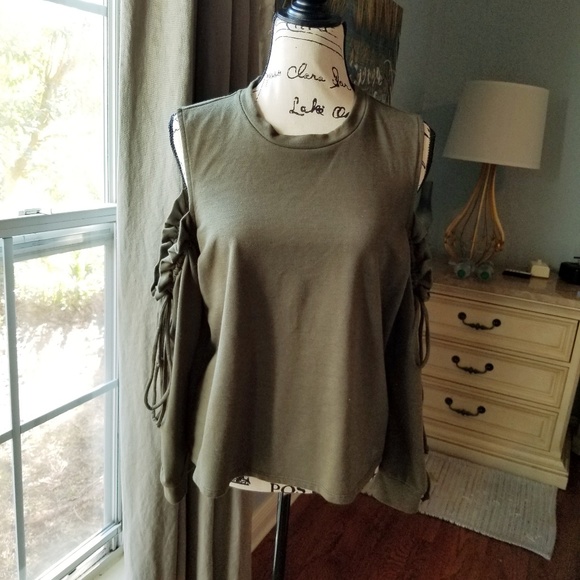 Off the shoulder top with ribbons around shoulder opening. Very cute and hard to show on pictures. Used twice. Like new. Army green.