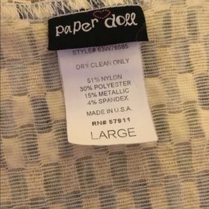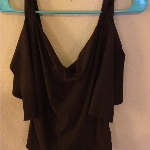 Dark brown top with gold shimmer accent. It is short sleeved and has sheer shoulder coverlets.