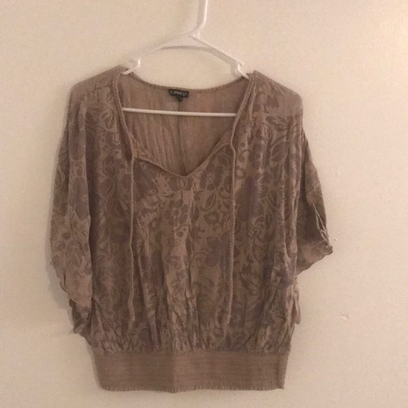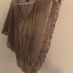 Loose top, large arm holes with sheer flower design, tank top would need to be worn underneath. Very comfortable and looks great with a pair of jeans!