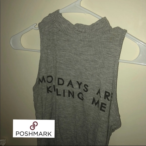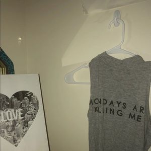 Sleeveless grey turtleneck top, with printed “Monday’s are killing me” across the front.