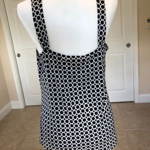 Playful White House Black Market polka dot top with fun ruffle front. Goes great with shorts, pants, or even a cute mini skirt. Great alone or under a black jacket or sweater.